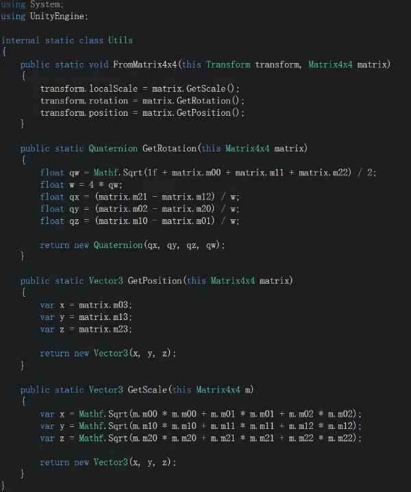 float qz = (matrix.m10 - matrix.m101) / w; transform.rotation = new Quaternion (qx, qy, qz, qw);