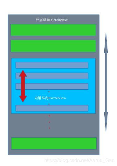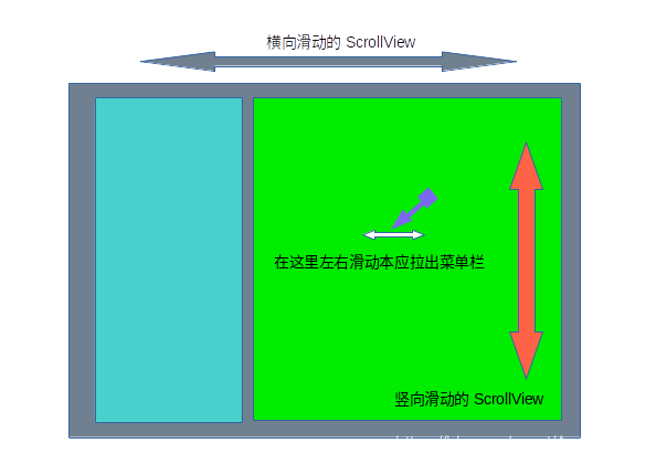 外层嵌套内层,图中绿色的item可以正常滑动,但是当触点在蓝色部分(子ScrollVew)的时候并不能响应内层深蓝色item的滑动,利用内部拦截法处理,不多说直接贴解决的代码: