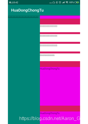 上面的代码删去了一些,处理滑动冲突的关键在于,具体的操作情景是怎样的,比如说这里,我的想法是将根据用户滑动屏幕的轨迹的斜率来处理,如果斜率大于1/3就表示用户是竖向滑动,否则就是横向滑动,要拉出菜单,那么就在外层横向ScrollView的onInterceptTouchEvent中的MOVE事件中编写处理代码,竖向滑动就返回false表示不拦截,事件将交给子LinearLayout(因为ScrollView不允许多个子View(ViewGroup),所以我还嵌套了一个LinearLayout,但没多大关系)下的纵向ScrollView处理,来进行竖向滑动;否则的话返回true表示拦截,那么事件就交到了横向ScrollView这里,就可以响应横向滑动拉出菜单了。