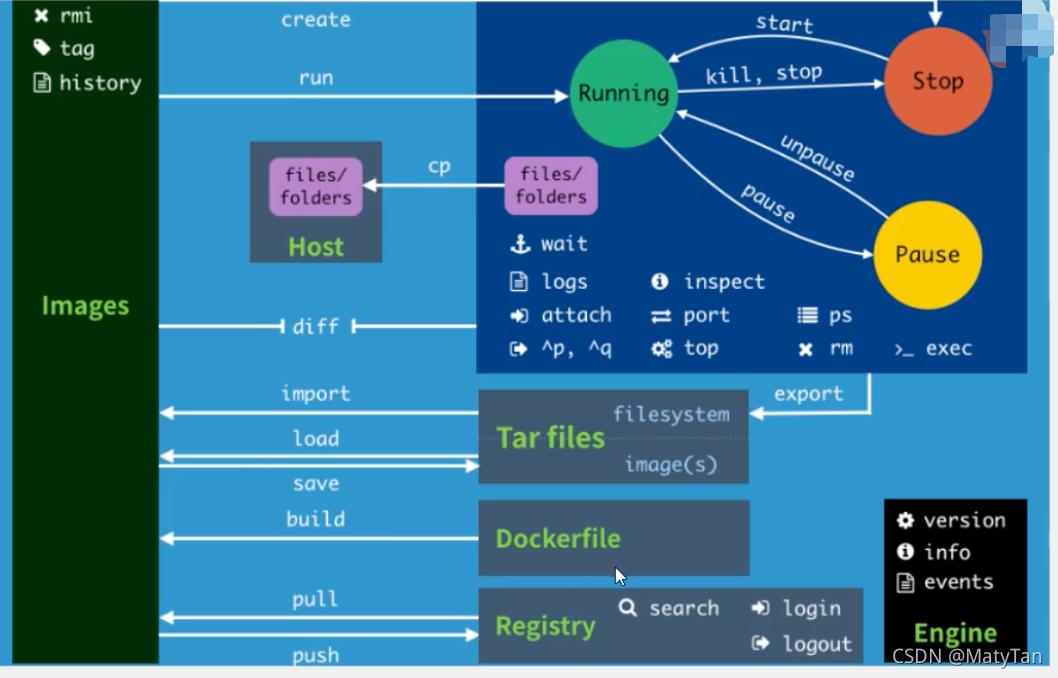 容器命令: 命令 描述 attach 将本地标准输入,输出和错误流转到到正在运行的容器 build 从Dockerfile构建映像 commit 根据容器的更改创建新镜像 cp 在容器和本地文件系统之 ...
