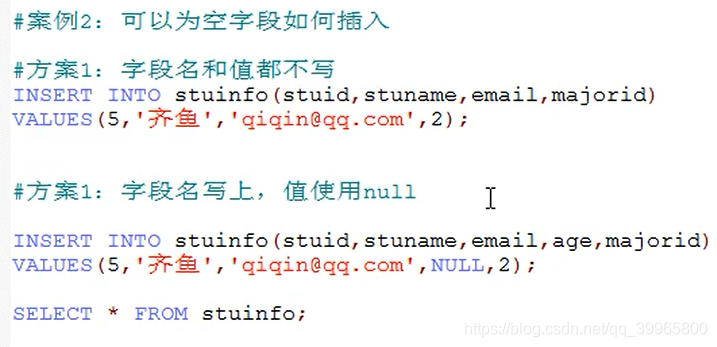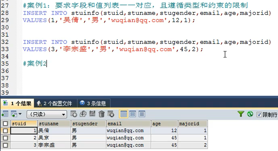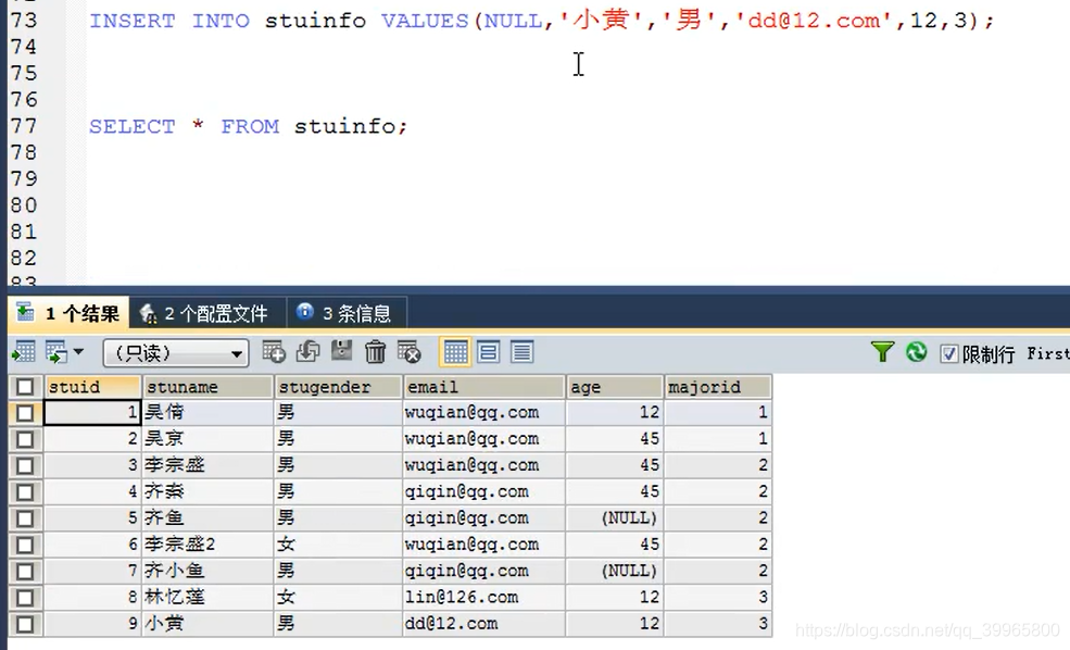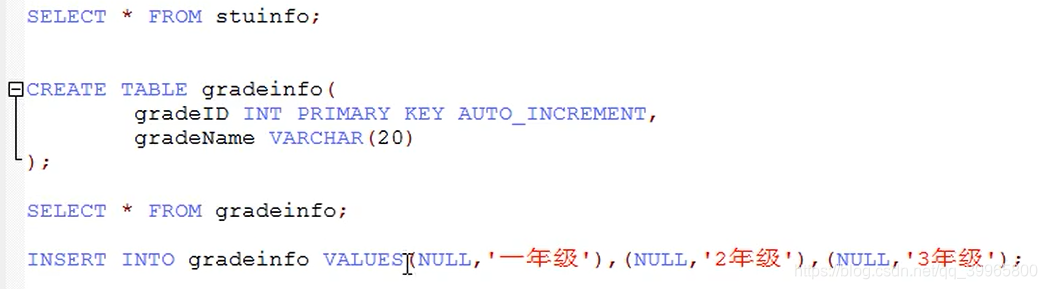INSERT INTO gradeinfo VALUES(NULL,'一年级'),(NULL,'2年级'),(NULL,'3年级');