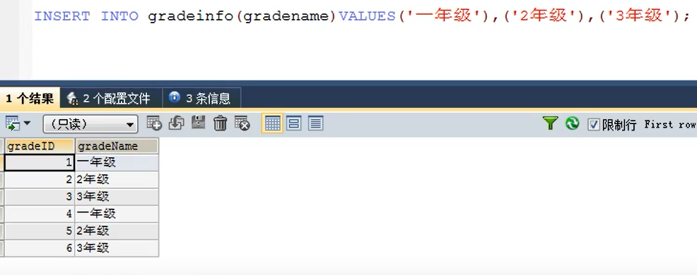 INSERT INTO gradeinfo(gradename)VALUES('一年级'),('2年级'),('3年级');