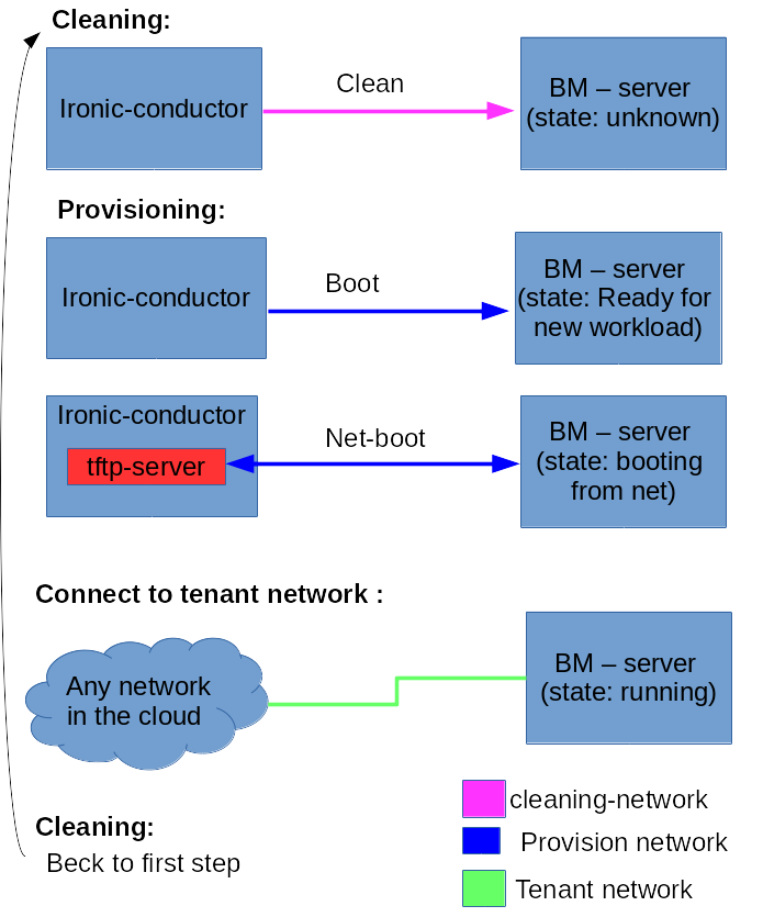 - Ironic can change the physical-ports that were used for provisioning network to be bind to tenant network. In such case the “bare metal” server will lose the connectivity with Ironic-conductor, and with “bare metal” provisioning.