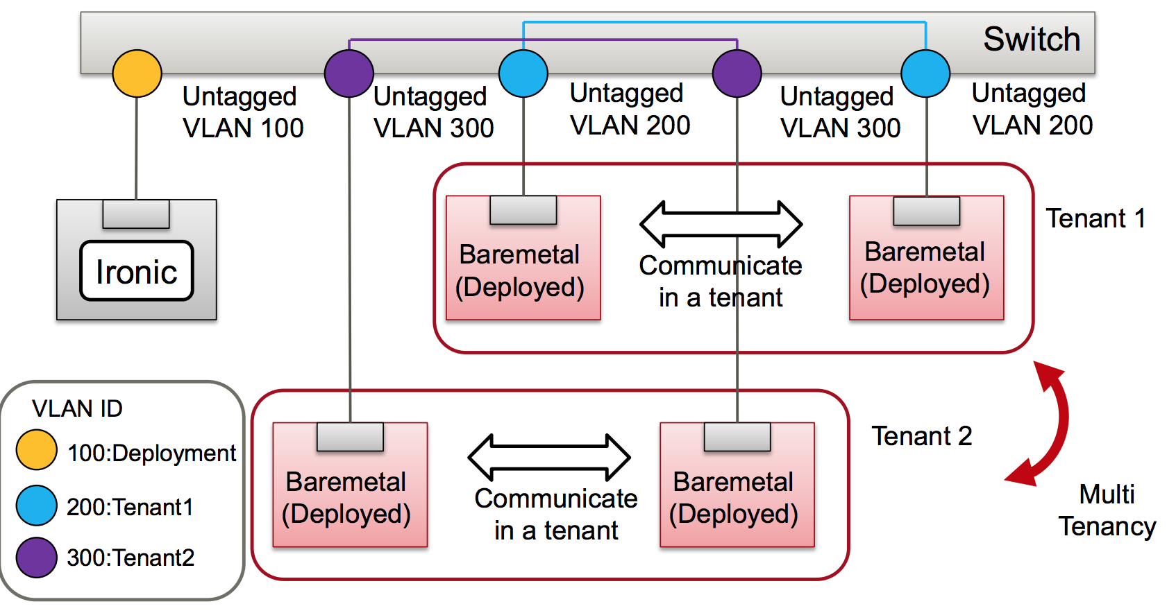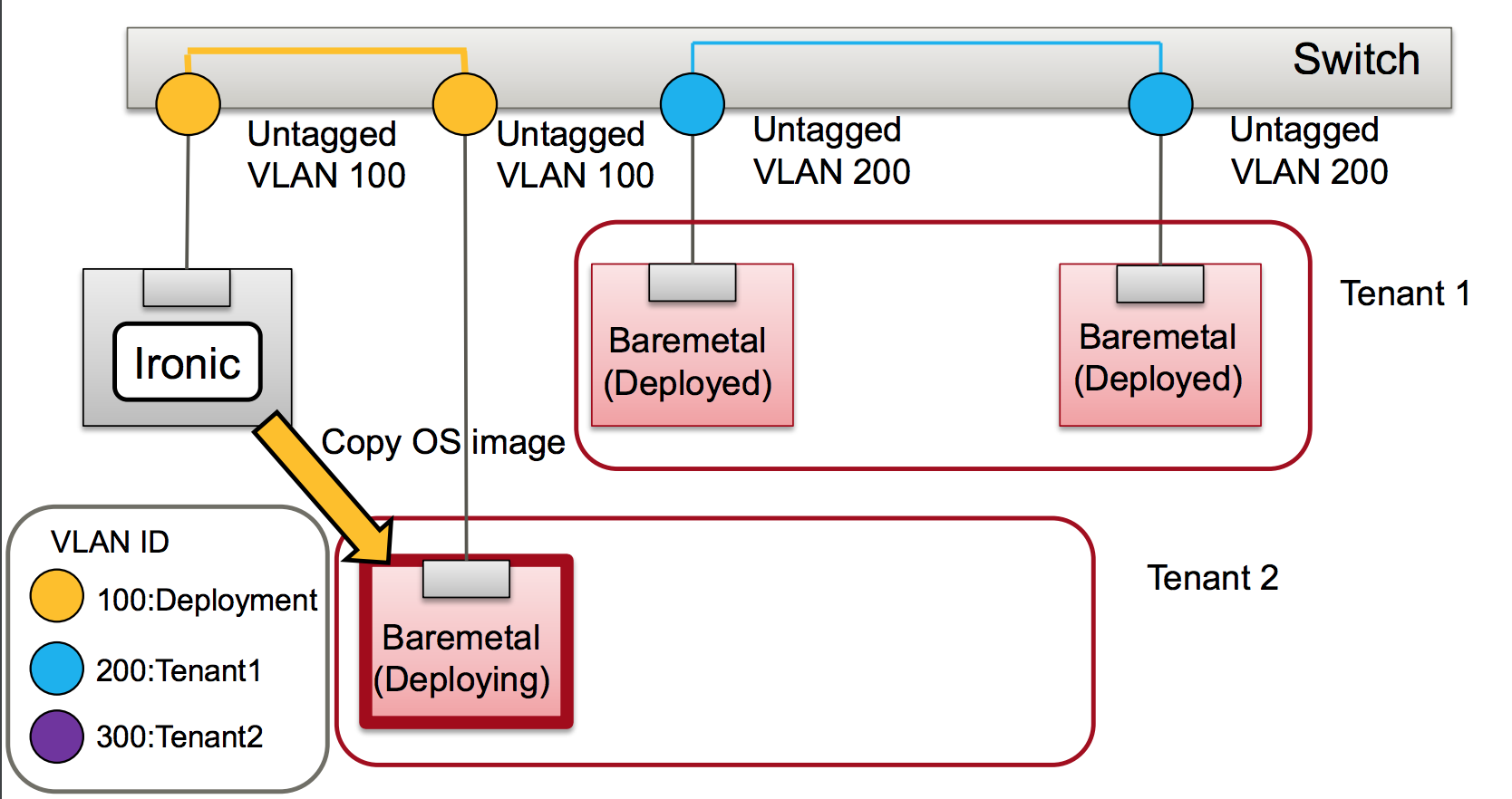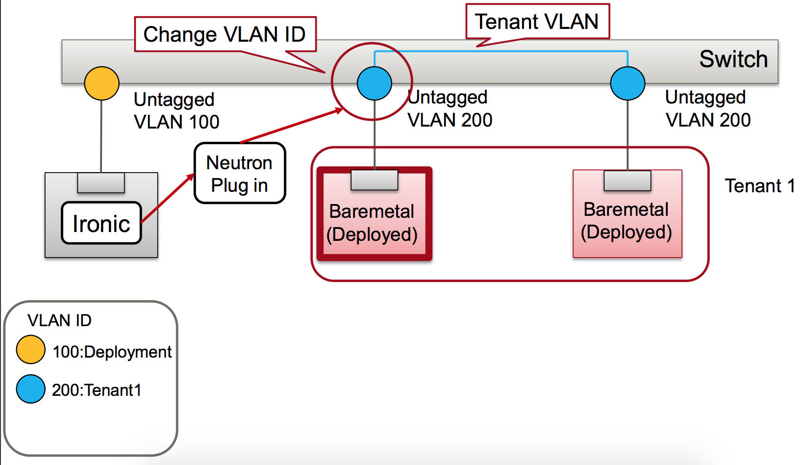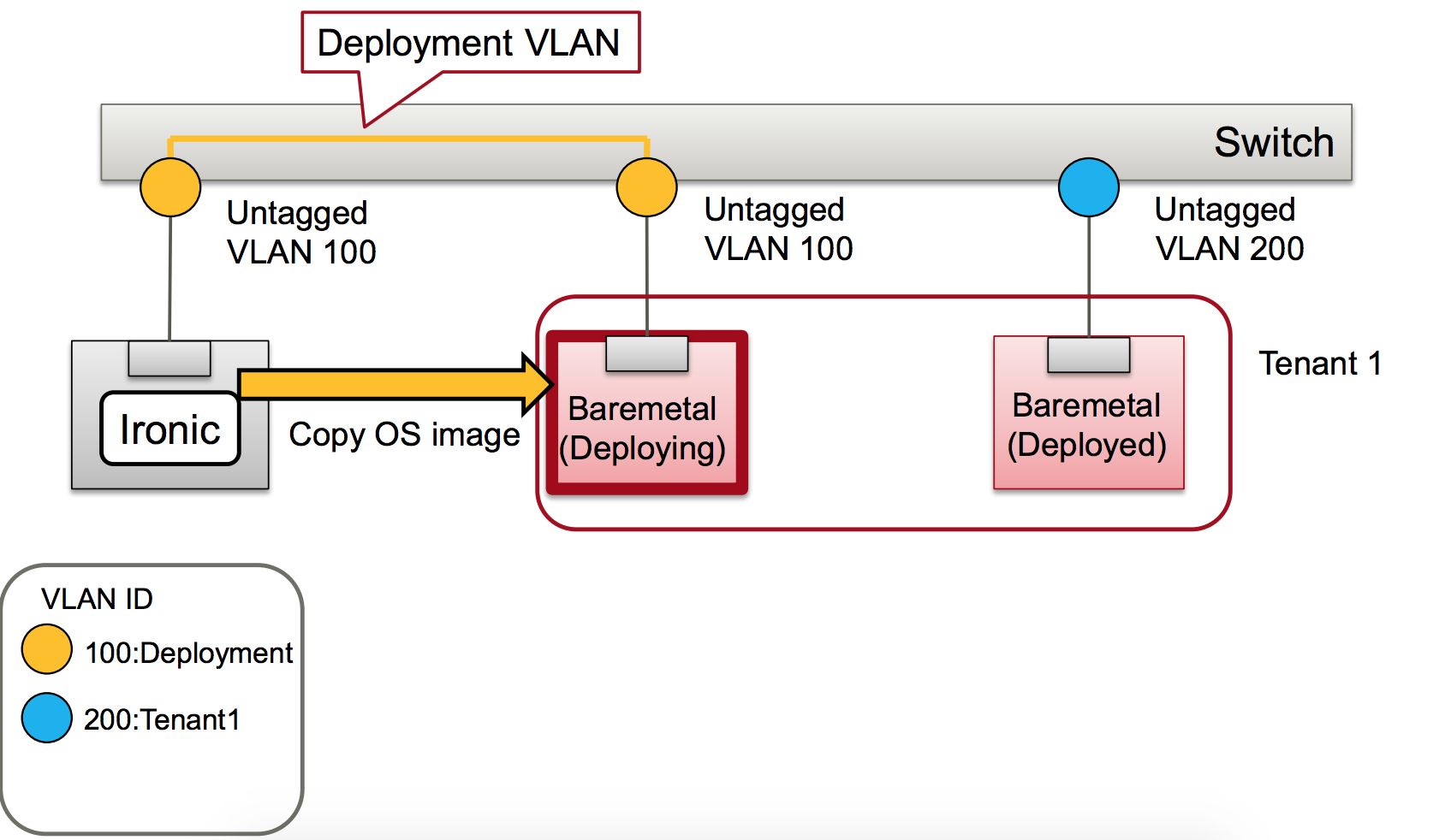 - After deployment, Ironic changes the VLAN ID so that the baremetal node connects to the tenant VLAN