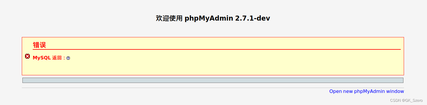 环境启动后,访问http://your-ip:8080,即可看到phpmyadmin的首页。因为没有连接数据库,所以此时会报错,但我们这个漏洞的利用与数据库无关,所以忽略。