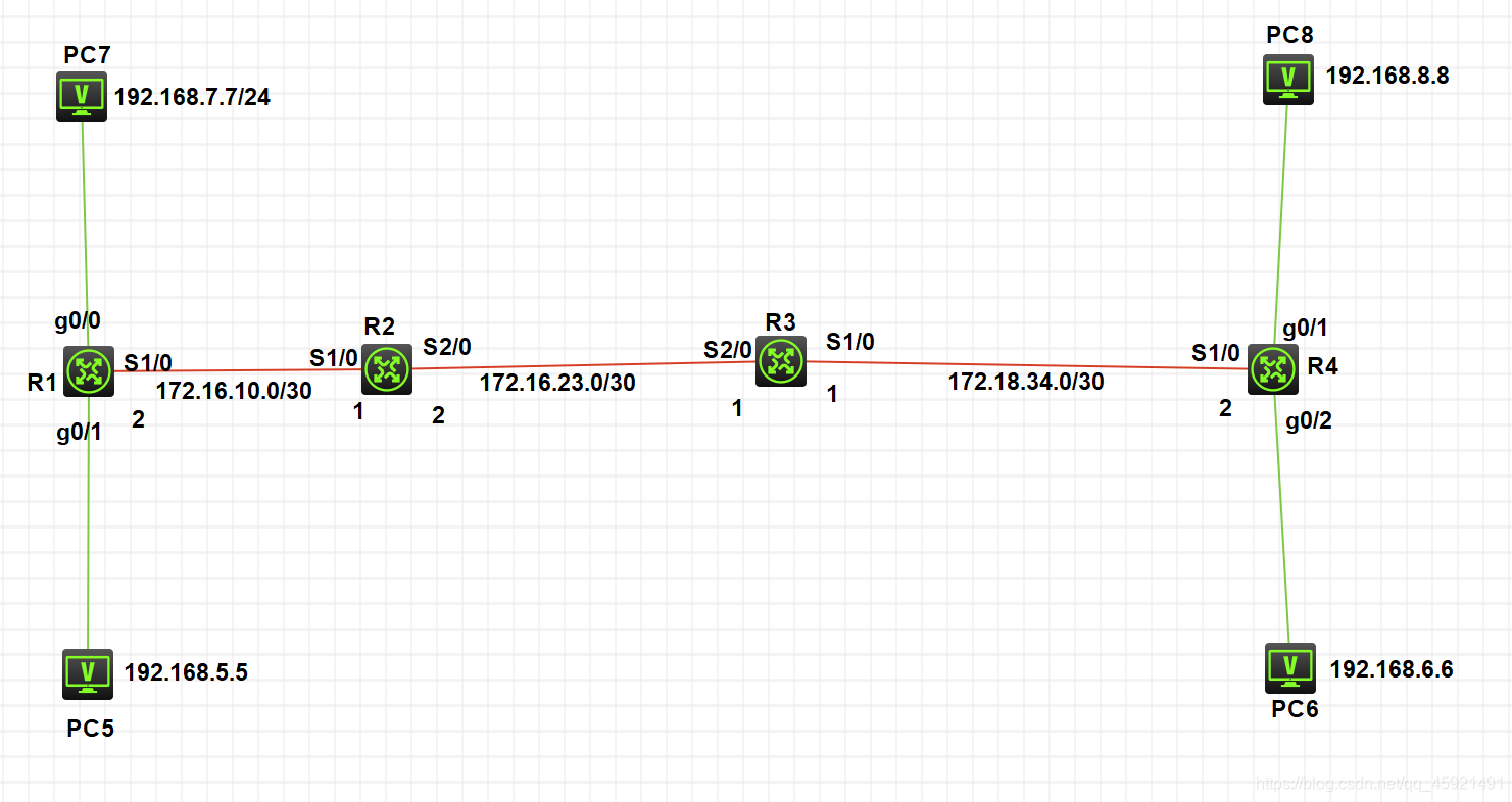 R4 配置PC7(192.168.7.7) 和 PC5(192.168.5.5)