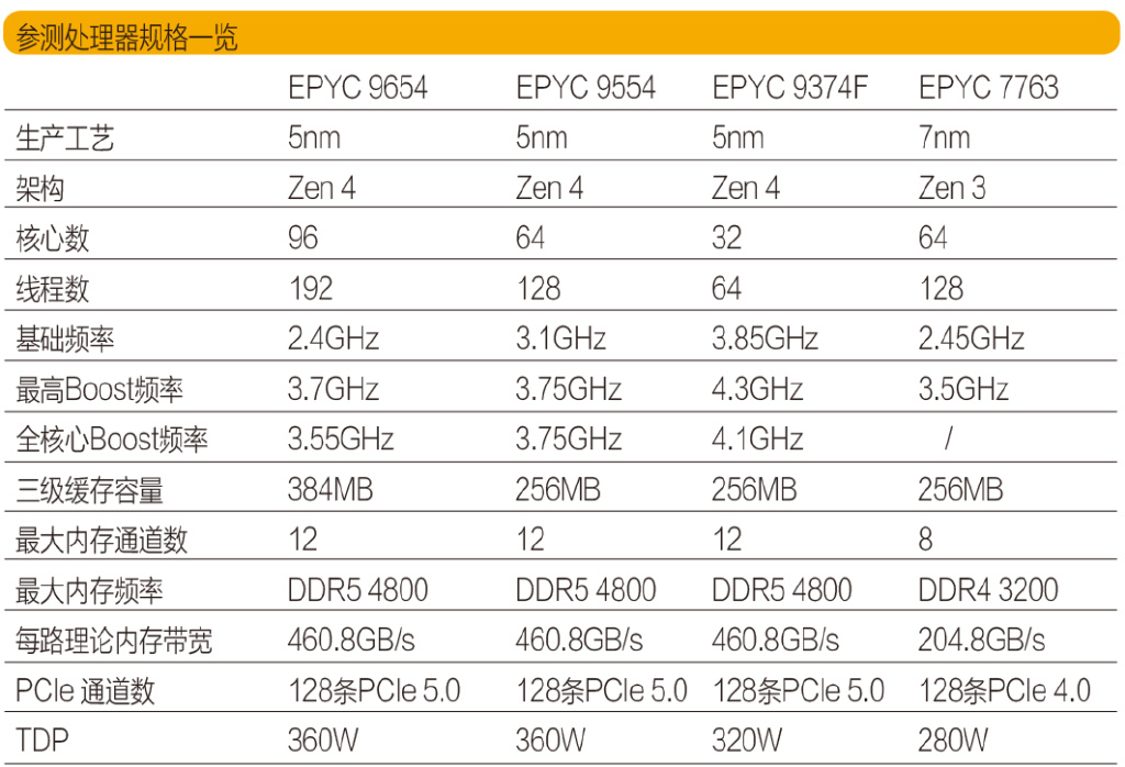 为了更直观地体现第四代EPYC 9004系列处理器的进步,我们还采用第三代AMD EPYC处理器中综合性能最强的EPYC 7763参与了测试,EPYC 7763采用Zen 3处理器架构,7nm工艺打造,基于64核心128线程设计,基准频率为2.45GHz,Boost频率最高为3.5GHz,TDP为280W,支持8通道DDR4 3200内存。在参测处理器中,AMD EPYC 7763的技术规格最接近AMD EPYC 9554,所以请大家特别注意EPYC 9554与EPYC 7763的差异,这也最能体现新一代处理器的进步所在。