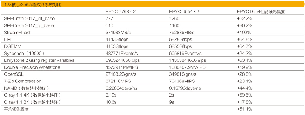 显然,凭借新一代Zen 4架构、对AVX-512指令集的支持、更高的工作频率、更强大的12通道DDR5内存配置,第四代EPYC 9004系列处理器在以上10大测试项目、13个测试小项中都大获全胜,特别是均为128核心、256线程配置的EPYC 9554双路系统在13个子项测试中相对于EPYC 7763双路系统的最大领先幅度达到102%,最小领先幅度也有17.8%。其平均领先幅度高达51.1%,用质的飞跃来形容毫不为过,而这仅仅是在第三代EPYC发布一年后就获得了如此大的进步,可以证明第四代EPYC 9004系列处理器的确是一款在技术架构设计、性能表现上非常成功的产品。