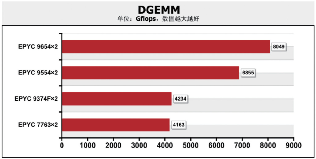 测试结果与HPL相比,可谓有过之而无不及,即便是64核心、128线程的EPYC 9374F双路系统也能小胜不支持AVX-512指令集,128核心、256线程配置的EPYC 7763双路系统。这充分说明,处理器支持AVX-512指令集后,的确能在支持AVX-512指令集的软件中实现处理器的运算性能翻番,以一打二。对于需要使用AVX-512相关软件的用户而言,升级基于Zen 4架构的AMD第四代EPYC 9004系列处理器显然是非常有必要的,可以大幅提高生产力。其他方面,核心、线程数更多的EPYC 9554,EPYC 9654双路系统自然有更强大的性能表现,其中EPYC 9654双路系统的算力突破8000GFLOPS,远超其他型号。