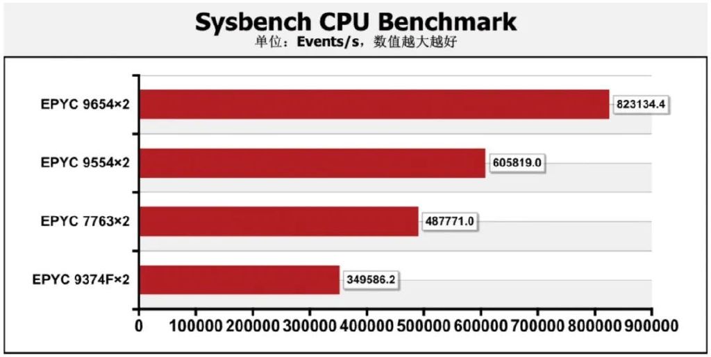 同样,这也是一个非常依赖处理器多核心运算性能的测试,EPYC 9654双路系统处于遥遥领先的地位,每秒可完成823134.4轮运算,比EPYC 9554多了35.8%。而EPYC 9554双路系统则凭借新架构、更高的工作频率比核心与线程数相同的上一代EPYC 7763双路系统多了24.2%。值得一提的是,核心与线程数只有EPYC 7763双路系统一半的EPYC 9374F双路系统在该测试中也达到了前者的71.6%,显然这同样应该归功于AMD第四代EPYC 9004系列处理器拥有更强的单核心运算性能,可以有效弥补这类处理器在核心数量上的不足。