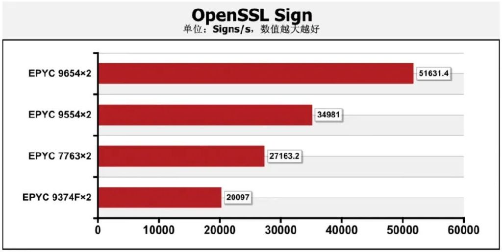 测试结果显示,OpenSSL测试显然是一个非常依赖处理器多线程运算性能的测试,不同核心数、线程数配置的双路系统在成绩上都有显著的区别。如拥有192核心、384线程的EPYC 9654双路系统在签名效率上比128核心、256线程配置的EPYC 9554双路系统快了47.6%。而EPYC 9554双路系统的签名效率又比64核心、128线程配置的EPYC 9374F双路系统快了多达74%。当然处理器架构、工作频率上的不同也可以在OpenSSL生成签名测试上拉开差距,如EPYC 7763双路系统与EPYC 9554双路系统虽然都为128核心、256线程配置,但后者的签名效率比前者快了28.8%,Zen 4架构的优势显而易见。