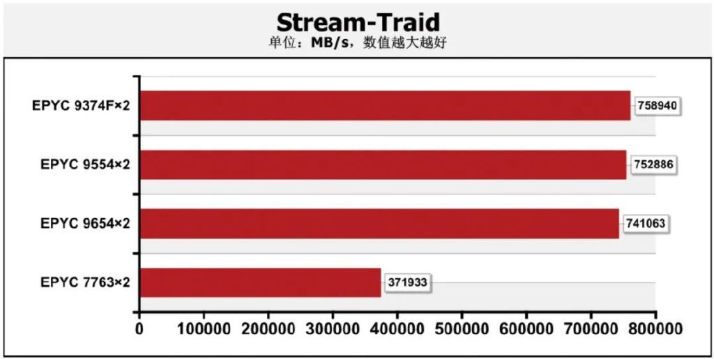同时更为惊人的是,即便核心、线程数更少的EPYC 9374F双路系统(64核心、128线程)也战胜了核心、线程数翻倍的AMD EPYC 7763双路系统。我们分析主要原因在于一是EPYC 9374F处理器的工作频率大大提升,其全核心加速频率可达4.1GHz,较EPYC 7763领先900MHz,可以有力弥补在处理器核心数上的不足。二是使用了新的Zen 4处理器核心,即便在同频率下,Zen 4处理器的IPC性能较Zen 3处理器都有14%的性能提升;三是AMD第四代EPYC 9004系列处理器的双路系统可以使用升级了规格的4条Infinity Fabric总线连接两颗处理器,其理论传输带宽最高可达PCIe 5.0 x64即256GB/s,较上代产品使用的PCIe 4.0 x64即128GB/s传输带宽翻倍,可以更通畅、充分地传输两款处理器之间的互联数据,不会存在数据传输瓶颈,从而能更高效地发挥出两颗处理器的最大计算性能;四还是带宽助力,AMD第四代EPYC 9004系列处理器采用的是12通道DDR5 4800内存系统,其每路理论内存带宽也比第三代EPYC使用的8通道DDR4 3200内存系统要大得多,从而也能更好地发挥出新处理器的运算性能。