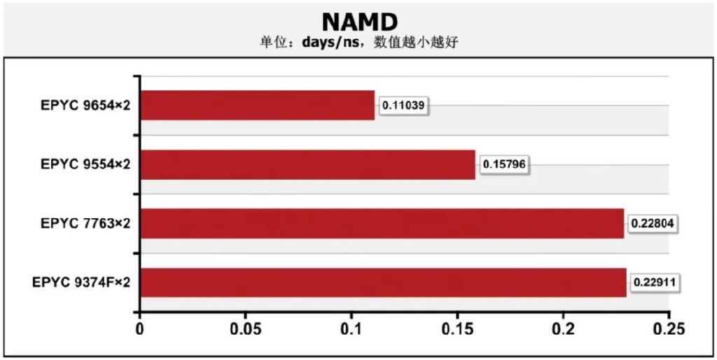NAMD 是一种并行的分子动力学代码,由伊利诺伊大学厄巴纳- 香槟分校贝克曼高级科学与技术研究所的理论和计算生物物理学小组开发,它主要用于大型生物分子系统的高性能模拟。本次测试中,我们主要通过NAMD来考察参测处理器的浮点性能。