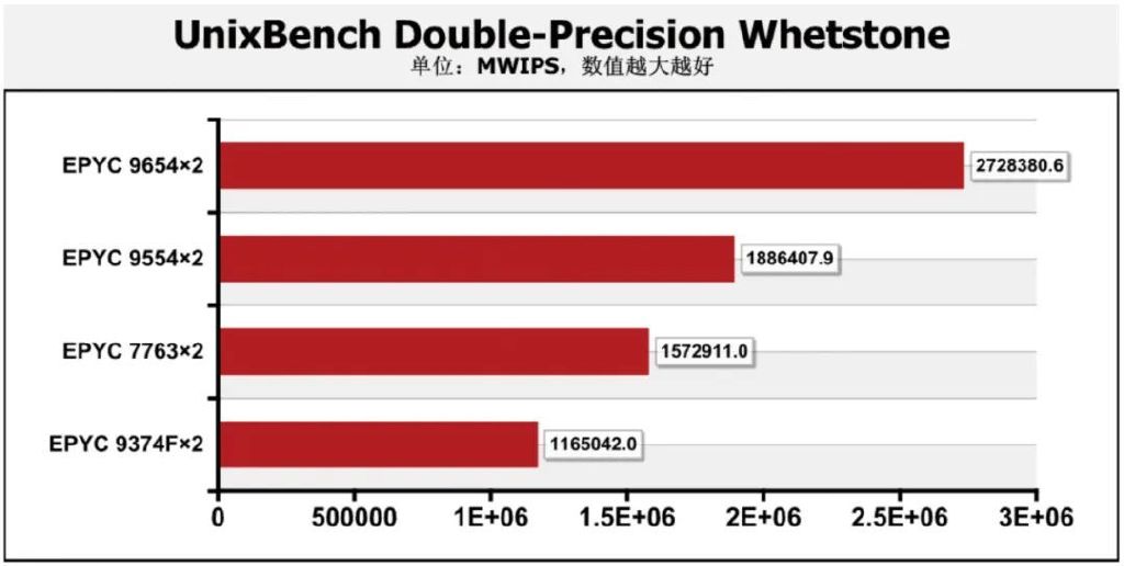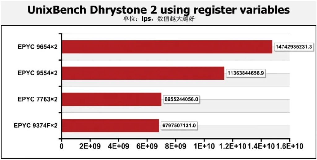 测试结果与SPECrate 2017类似,首先EPYC 9554双路系统在体现整数性能的Dhrystone 2 using register variables上领先EPYC 7763双路系统高达63.4%,在双精度浮点性能运算上也领先了19.9%,作为两个处理器核心数量、线程数相同的双路系统,第四代EPYC 9004系列处理器的进步得到了充分体现。值得一提的是,64核心、128线程配置的EPYC 9374F双路系统也再次展现了单核心性能大幅增加的实力,其整数性能只落后EPYC 7763双路系统约2.3%,要知道它的处理器核心数量可是比后者少了64颗。而192核心、384线程的EPYC 9654双路系统继续压倒群雄,其整数性能、双精度浮点性能分别领先EPYC 9554双路系统达29.7%、44.6%。