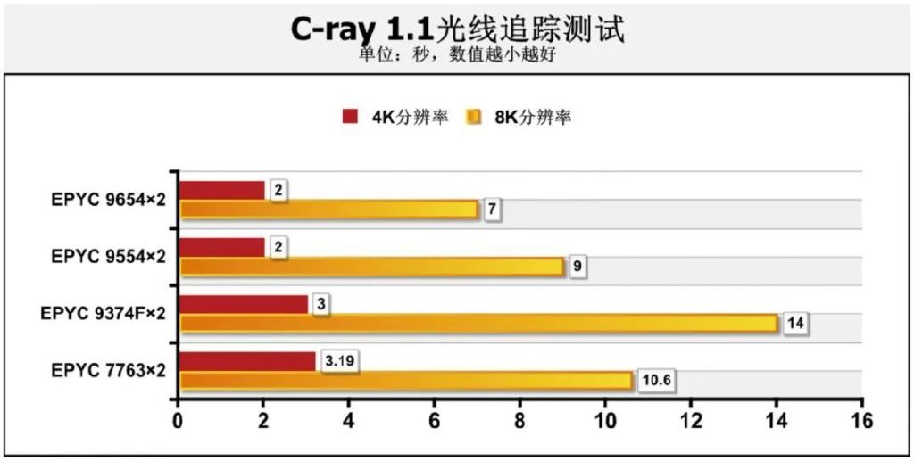 C-ray 是一种常用的光线追踪基准测试,可以显示多线程工作负载下处理器的差异,时间越短说明系统性能越强。在本次测试中,我们使用了4K和8K这两种分辨率进行测试,从而对比参测系统在不同负载下的性能差异。