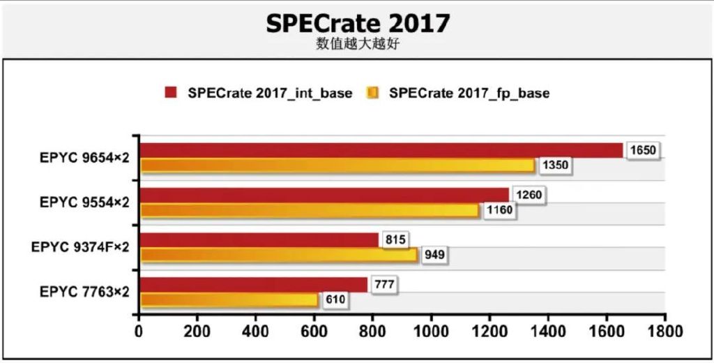 SPECrate 2017 测试的是在单位时间内运行的实例数量,这是服务器采购时的主要性能指标,所以服务器厂商和处理器厂商通常提供的是这一测试成绩。在SPECrate 2017 中包含SPECrate Integer 和SPECrate Floating Point,前者测试的是整型并发性能,后者测试的是浮点并发性能。