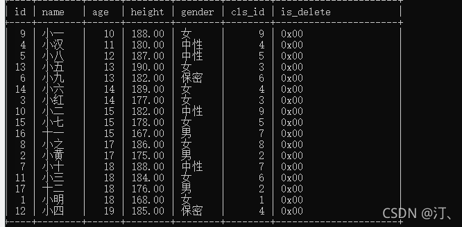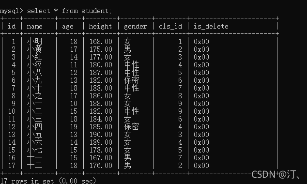 create table student( id int unsigned primary key auto_increment not null, name varchar(20) default '', age tinyint unsigned default 0, height decimal (5,2), gender enum('男', '女', '中性', '保密') default '保密', cls_id int unsigned default 0, is_delete bit default 0 );
