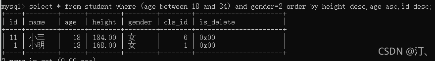 select * from student where (age between 18 and 34) and gender=2 order by height desc,age asc,id desc;