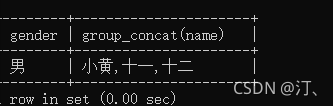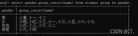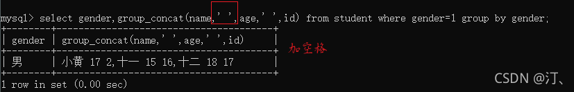 select gender,group_concat(name,' ',age,'',id) from student where gender=1 group by gender;