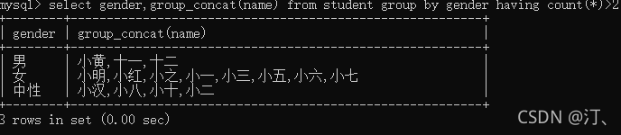 select gender,group_concat(name) from student group by gender having count(*)>2;