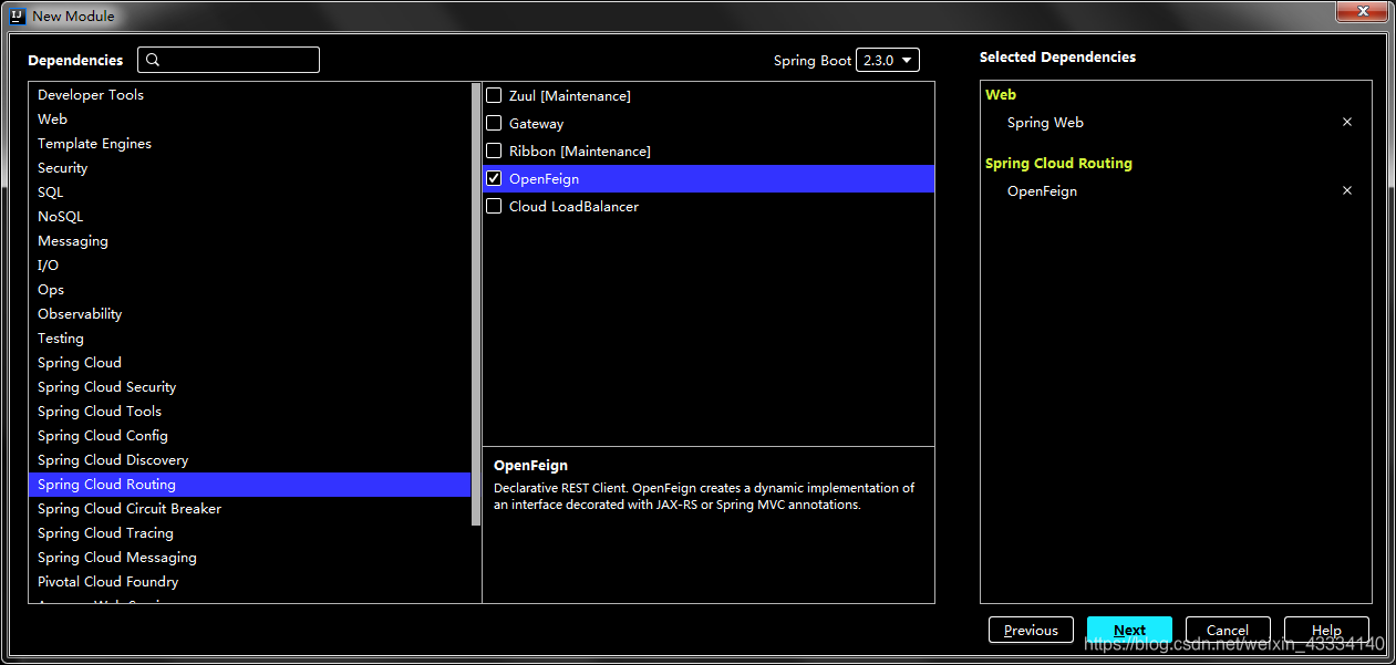 勾选必要的依赖,因为微服务之间需要互相调用,此处利用Spring Cloud Routing 的OpenFeign实现
