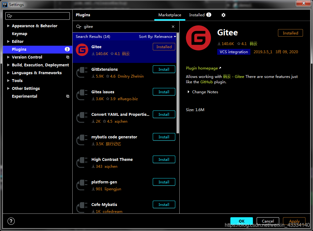点击file -->setting–>plugins下载码云插件gitee