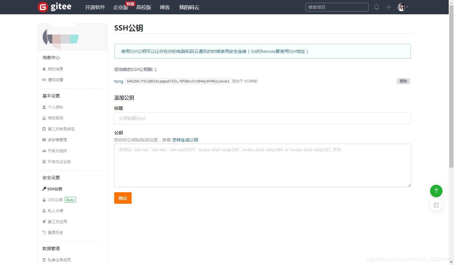 点击ssh公钥 设置标题,将复制好的公钥添加到公钥内,确定,输入登录密码验证