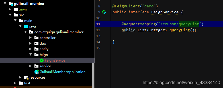 然后将被调用者controller层需要远程调用的方法体以及完整的@RequestMapping("/coupon/queryList")路径,复制到调用者声明为@FeignClient(“demo”)的接口