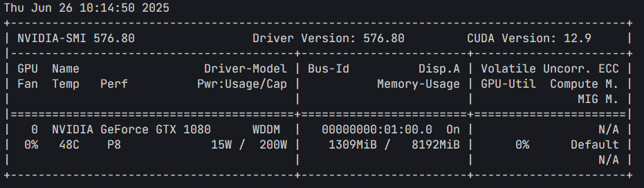 CUDA Version: 12.9。(驱动支持的最大 CUDA 版本,之前版本太低了,下载个新的安装,升级,重新启动电脑)