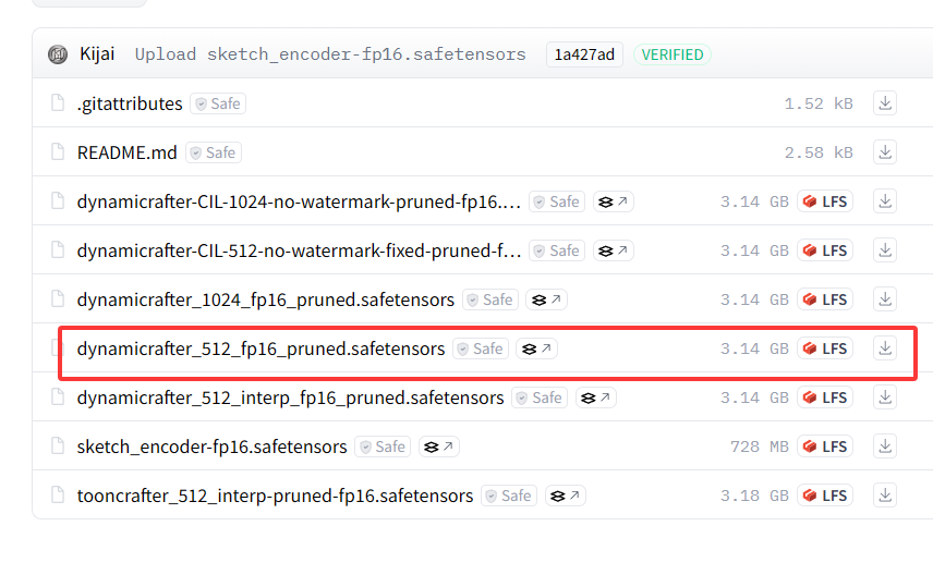 如果你的电脑GPU相当不错,可以考虑原始模型10G。(下载里面的文件 model.ckpt,然后重命名:dynamicrafter_512_v1.ckpt)