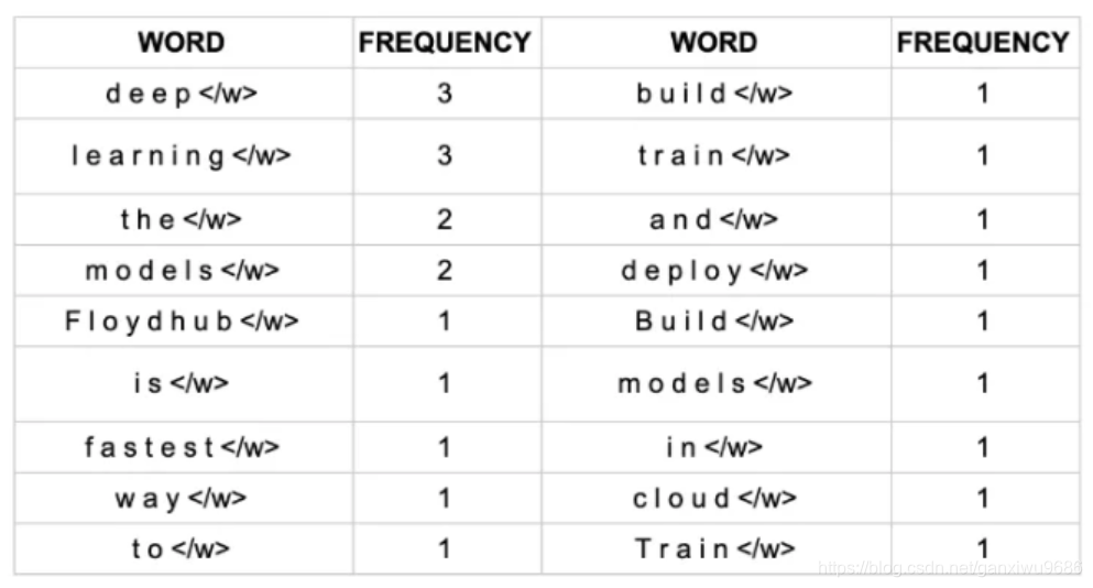 对于这个案例,我们可以统计每个单词出现的次数(每一单词后面</w>表示单词的结束,告诉算法识别边界):