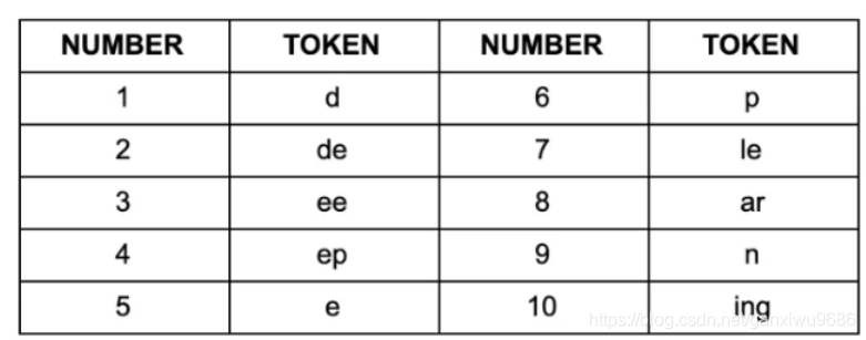 </w>。例如"deep"变成"d e e p </w>" - 寻找最常见的成对字符例如:
