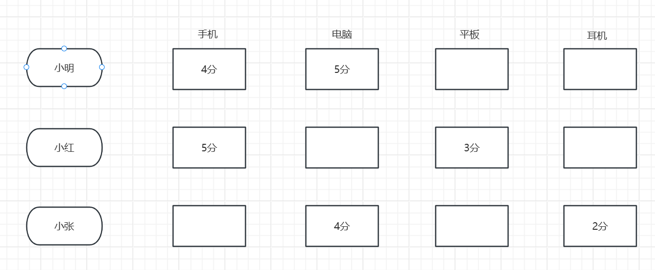 小明给手机和电脑评分分别是4分和5分,小红给手机和平板评分是5分和3分,小张给电脑和耳机评分是4分和2分。