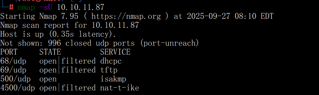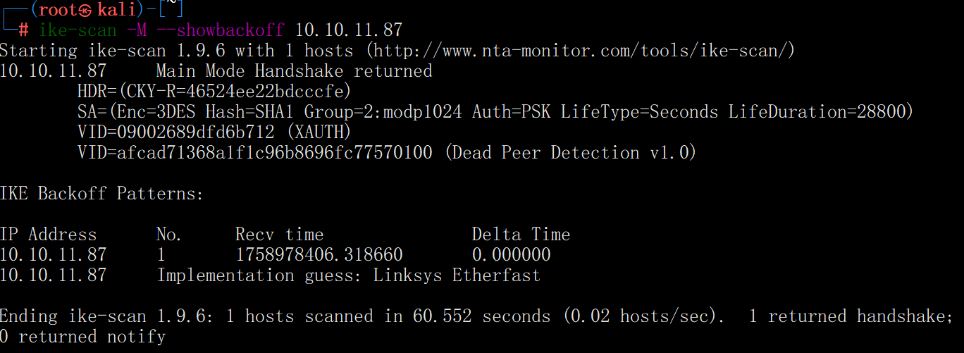 最后一行的1 returned handshake; 0 returned notify 意味着目标已配置IPsec并愿意执行IKE协商,且您提议的一种或多种转换方案是可接受的(有效转换方案将在输出中显示)