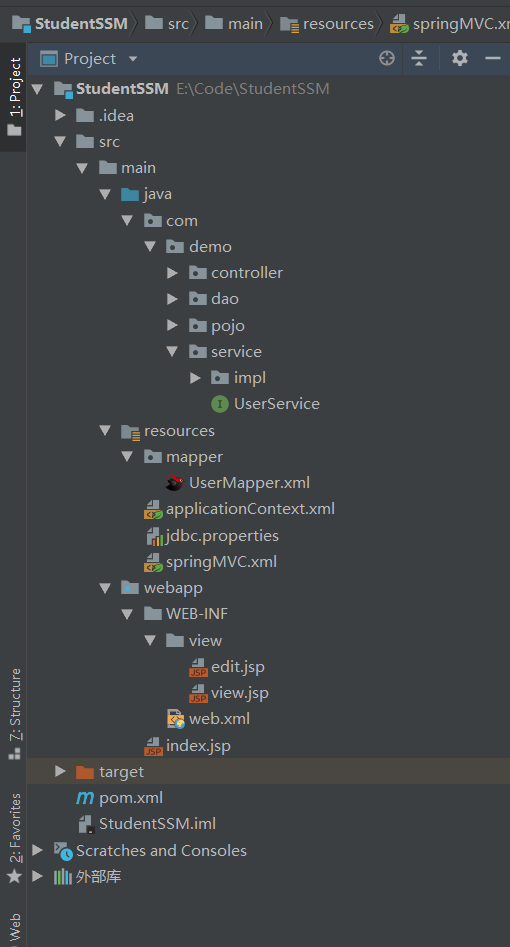 resources目录下添加:springMVC.xml,并且根据文件中‘视图定位’的配置,所以在WEB-INF下创建jsp文件夹