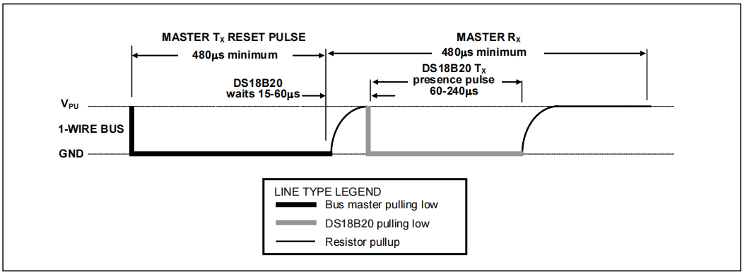 如果不存在就还是高电平 - 延时(cpu读到18b20回应的低电平后,还要做延时;其时间是从发出高电平(第4步)时间算起,至少要480us