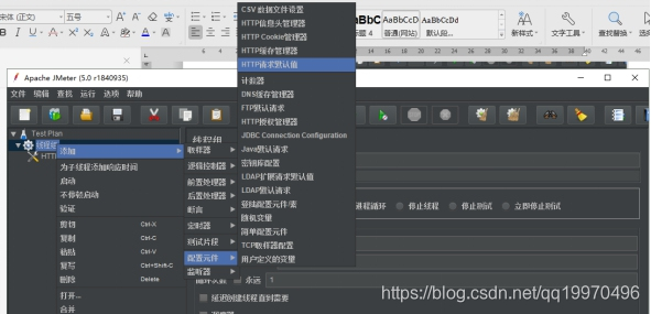 添加->配置元件->HTTP请求默认值,设置服务器IP和端口号