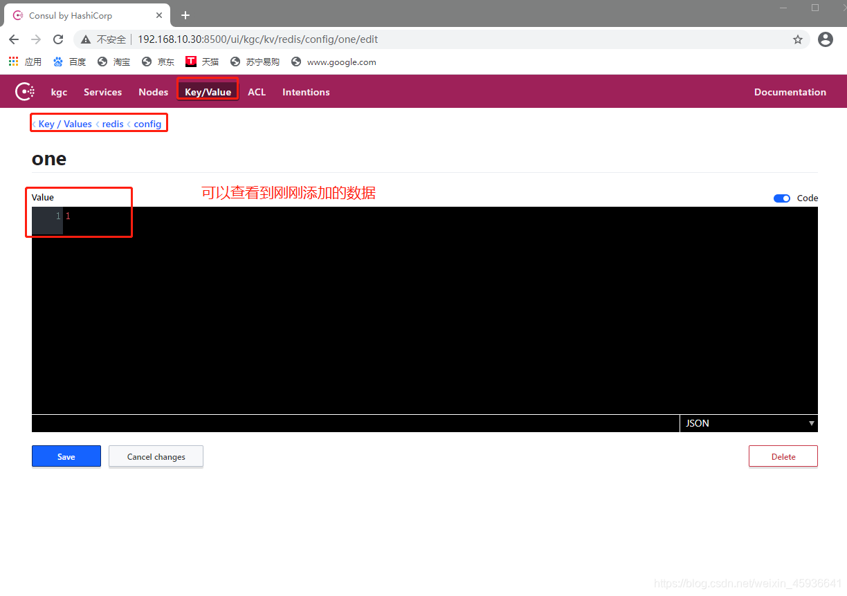 [root@localhost ~]# consul kv delete redis/config/one #删除