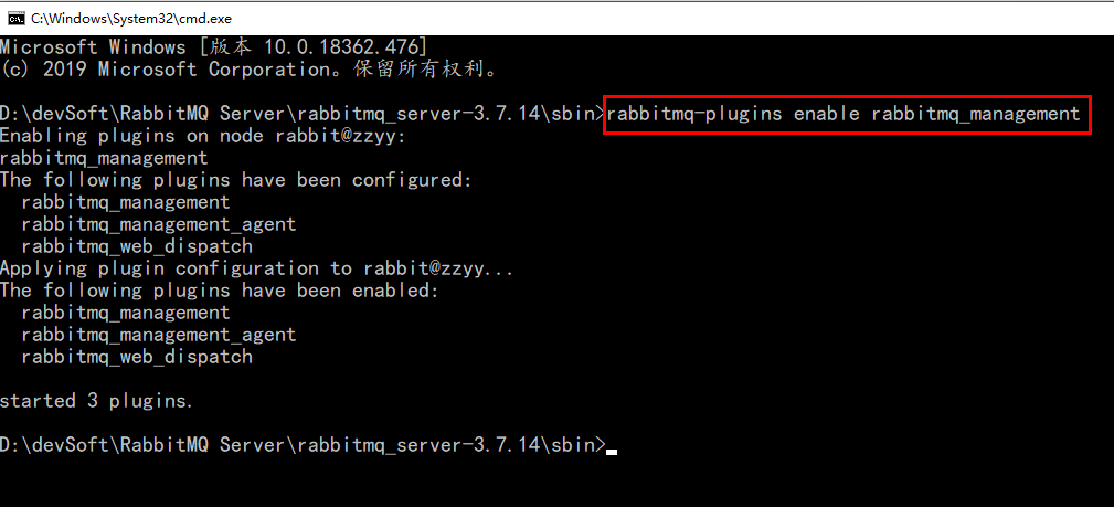 4。进入RabbitMQ安装目录下的sbin目录输入以下命令启动管理功能
