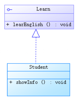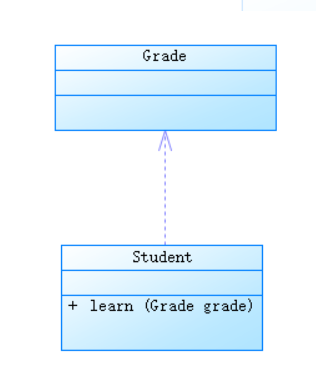 | 依赖 | 箭头指向入参类 | 一个类A使用到了另一个类B,但是这种使用关系是具有偶然性的、临时性的、非常弱的,但是类B的变化会影响到类A。比如班级类和学生类,班级类作为学生类的方法入参。 | ![]() |