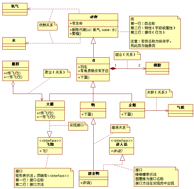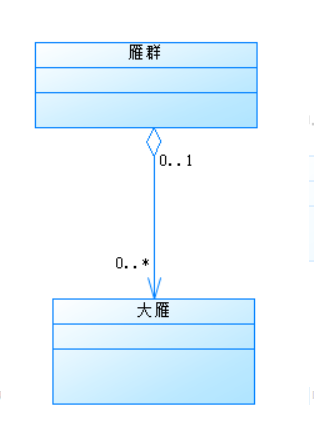 | 聚合 | 菱形部分指向整体,箭头指向个体 | 整体和部分的关系。比如大雁和雁群之间的关系,两者不是生命周期不同。 | ![]() |
