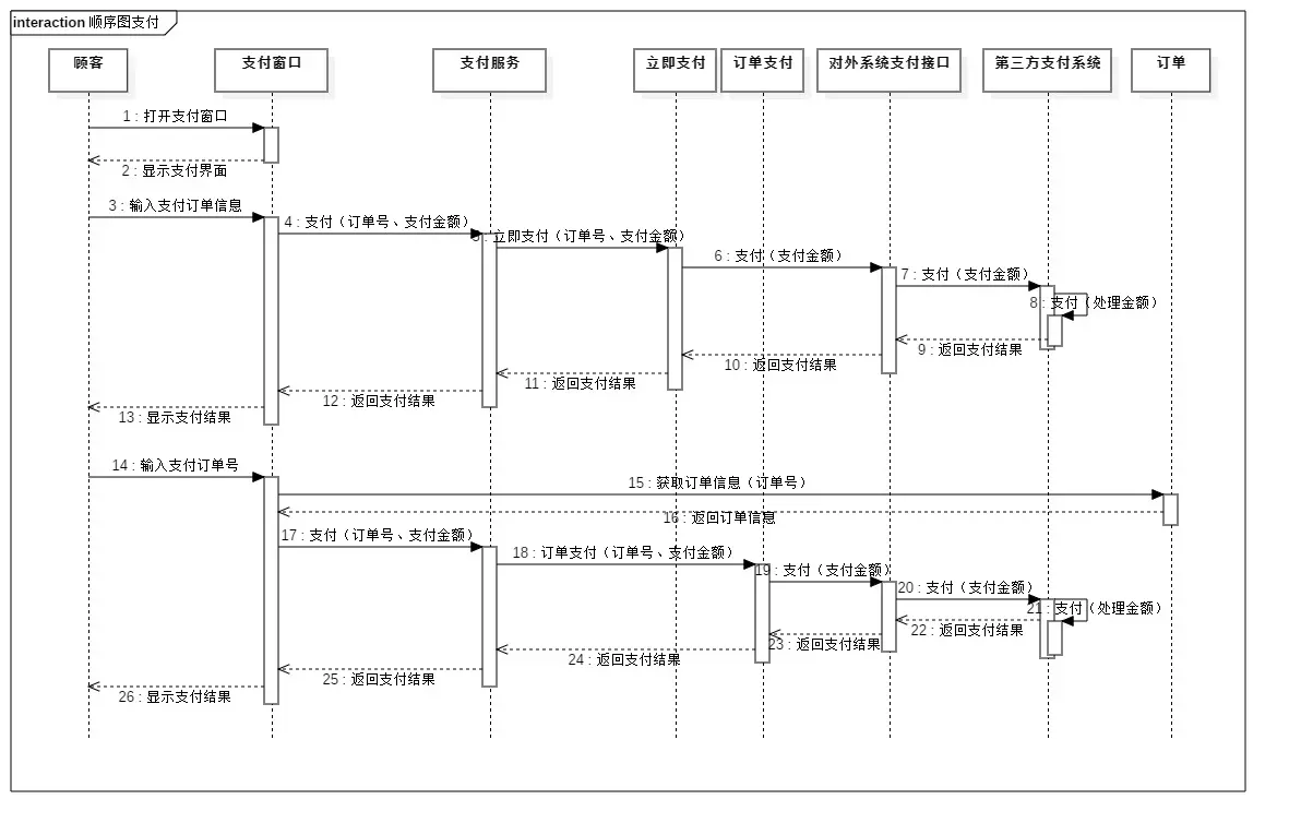| 顺序图 | 按照时间顺序从上到下来表示生命线之间的信息交互,可结合用例图表示某个用例的场景。 |