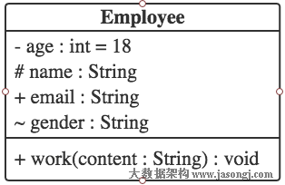 一个Employee类,它包含private属性age,protected属性name,public属性email,package属性gender,public方法work()。