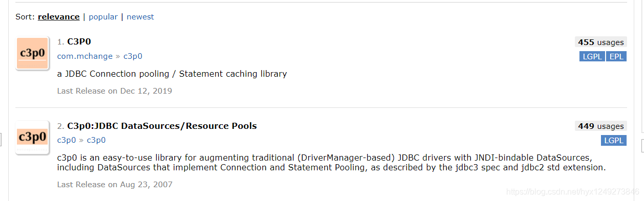 在运行测试类的时候莫名其妙的报了个 NewProxyResultSet.isClosed()Z is abstract 这个错误,之前出现过这个错误,以为是版本出现了问题 就将版本 0.9.1.2 改成大多数人用的 0.9.5.2 版本,发现还是报错。后来亲自去 Maven 存储库专门搜了下 c3p0 ,发现有两个。。。