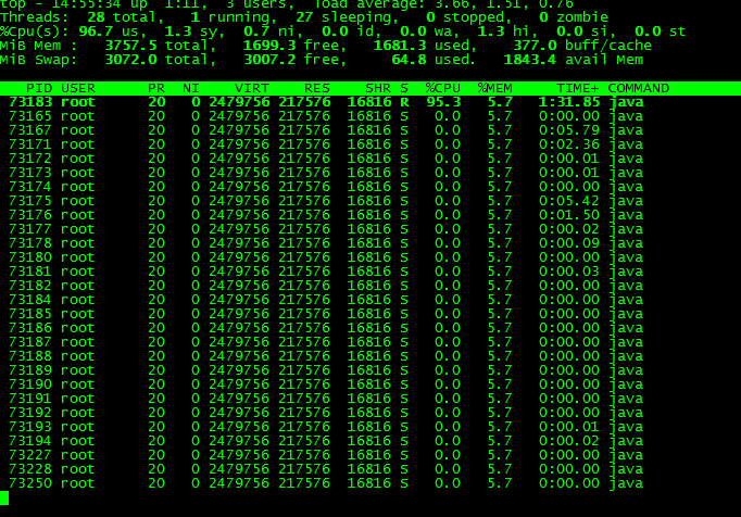 我首先创建了一个很简单的springboot的项目,然后提供了一个接口,接口的方法体中有个双层循环(方法代码见下面的mockdump),把该项目部署到linux服务器上,启动后的进程id是73165,执行shell命令top -H -p 73165,然后通过浏览器访问该方法。之后观察到线程号73183的cpu使用率高达95%(见下图),然后通过jstack查看线程堆栈信息(见最后的shell命令执行的结果),发现异常信息指向了64行双层循环处,即定位到了代码异常点。