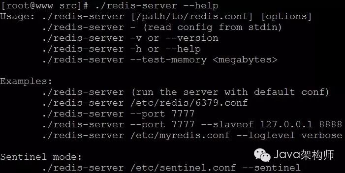 这时在src目录下会多出几个可执行程序,其中redis-server是服务主程序。我们运行redis-server --help看看有哪些参数: