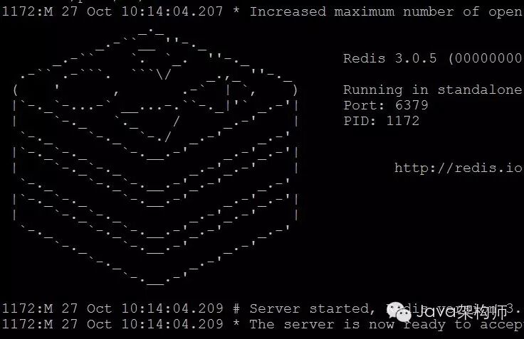 后两个重启生效。再次运行redis-server命令,只存在一个没有指定config文件使用缺省配置的警告。启动画面如下: