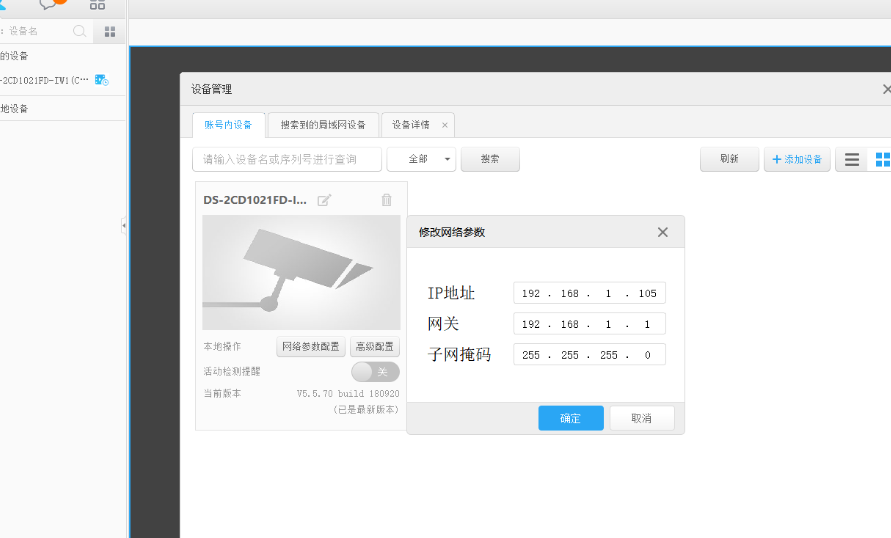 我们拔掉摄像机跟电脑直连的网线,按照博主的另外一篇博客https://blog.csdn.net/u014552102/article/details/86700057里面的方法使电脑在wifi网络下和摄像机也在wifi网络下时,电脑客户端能监控摄像机的画面。然后在下图电脑客户端中,我们可以得到博主的摄像机的ip地址为192.168.1.105(注意,这个是摄像机连接wifi时的ip地址,当摄像机通过网线直接连接电脑时,ip地址就不是这个了)