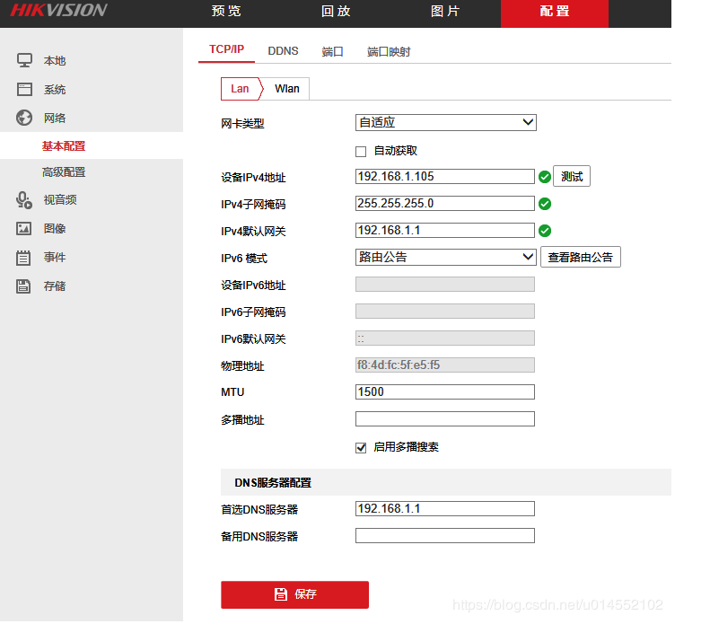 然后我们在下图的“配置”->“网络”->“基本配置"下,更改设置如下。其中“Lan”为摄像机连接了网线时的参数信息,"Wlan"为摄像机连接了wifi时的参数信息。我们在“Lan”中将“自动获取”前面的勾去掉,这样摄像机每一次断掉wifi通过网线直连电脑时的ip地址都不会发生变化了。我们设置“设备IPv4地址”为192.168.1.105,"IPv4子网掩码“为255.255.255.0,”IPv4默认网关”为192.168.1.1。这些地址大家都可以根据自己的需要自行设置,博主只是作个演示,注意不要ip冲突了”。设置完后,点击“保存”。
